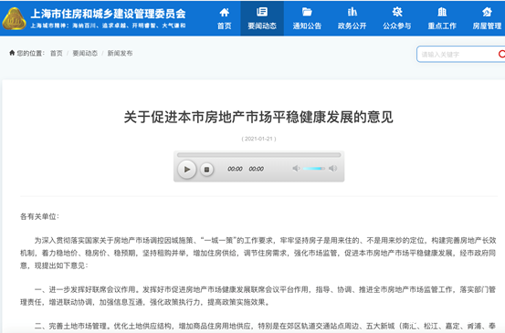 1月21日,为深入贯彻落实国家关于房地产市场调控因城施策、“一城一策”的工作要求,坚持“房住不炒”定位,促进上海市房地产市场平稳健康发展,经上海市政府同意,上海市住房和城乡建设管理委员会、上海市房屋管理局、上海市规划和自然资源局、上海市财政局、上海市税务局、人民银行上海分行、上海银保监局、上海市市场监督管理局联合印发《关于促进本市房地产市场平稳健康发展的意见》(以下简称《意见》),自2021年1月22日起实施。