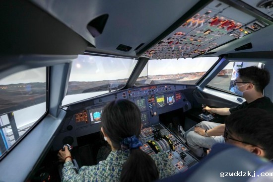 在第三届民航科教创新成果展的中国南方航空公司展区,参观者在体验南航自主研制的空客A320飞行与导航程序训练器(FNPT)。新华社记者 鞠焕宗 摄